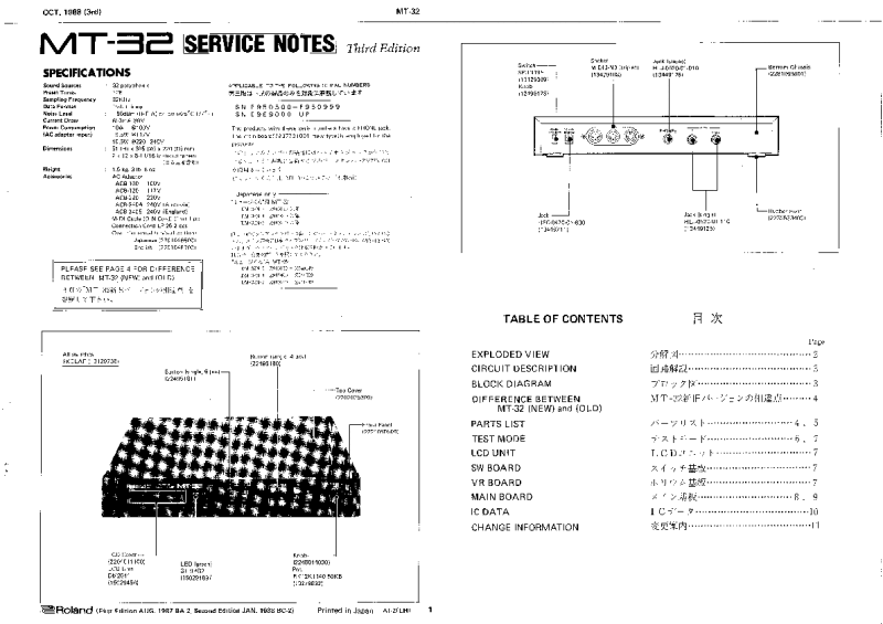 The Roland MT-32 Service Notes are a technician-focused repair manual that documents the unit’s specifications, internal boards and circuits, exploded assembly views, parts lists, test mode procedures, schematics, and revision/change information for servicing the module. |