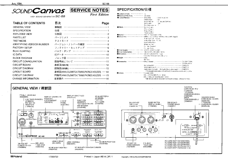 The Roland SC-88 Service Notes are a repair manual covering the module’s specifications, internal layout, parts lists, factory and test procedures, board-level diagrams, schematics, and change information for servicing the unit. |
